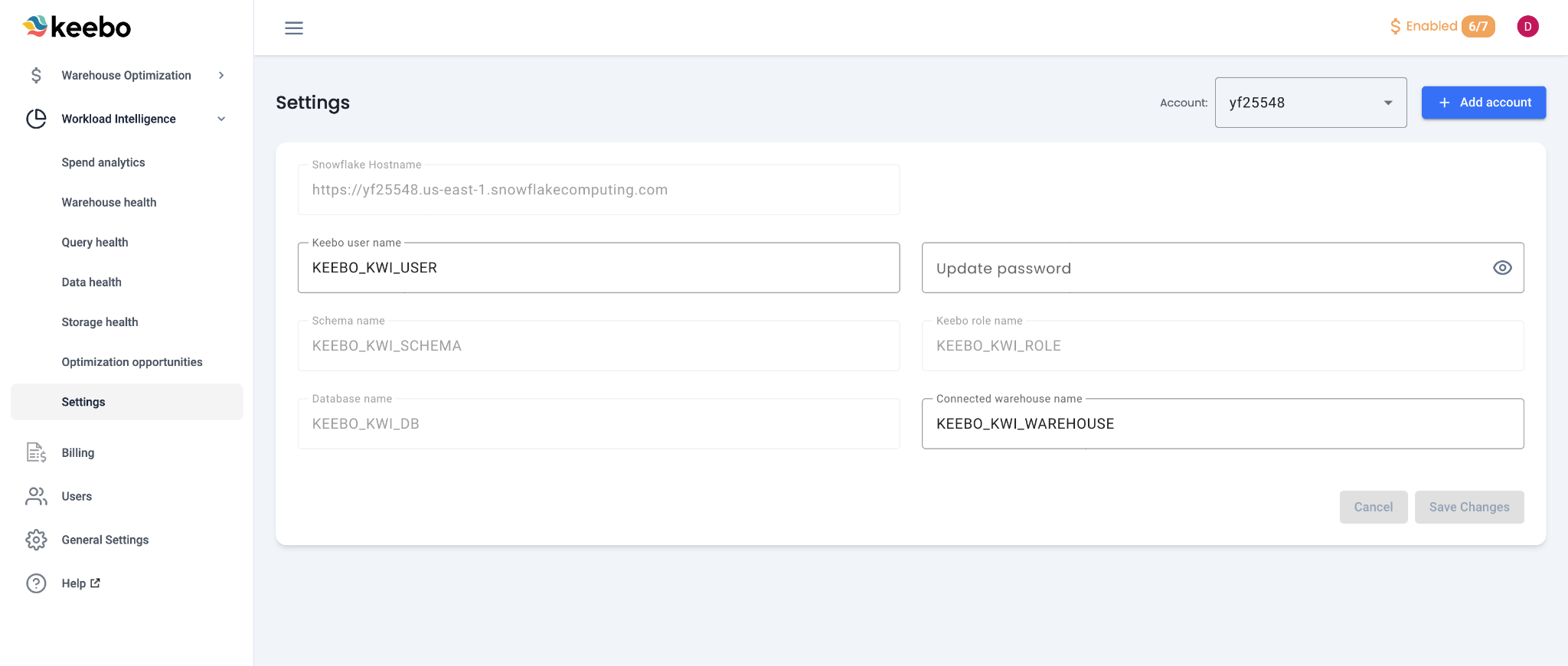 In "Settings," the Keebo user name, Keebo warehouse name, and password or private key can be changed for a selected account. The account can also be switched between basic and key pair authentication from this page. If the authentication method changes, a command must be run in the Snowflake console. Follow the instructions provided in the form.