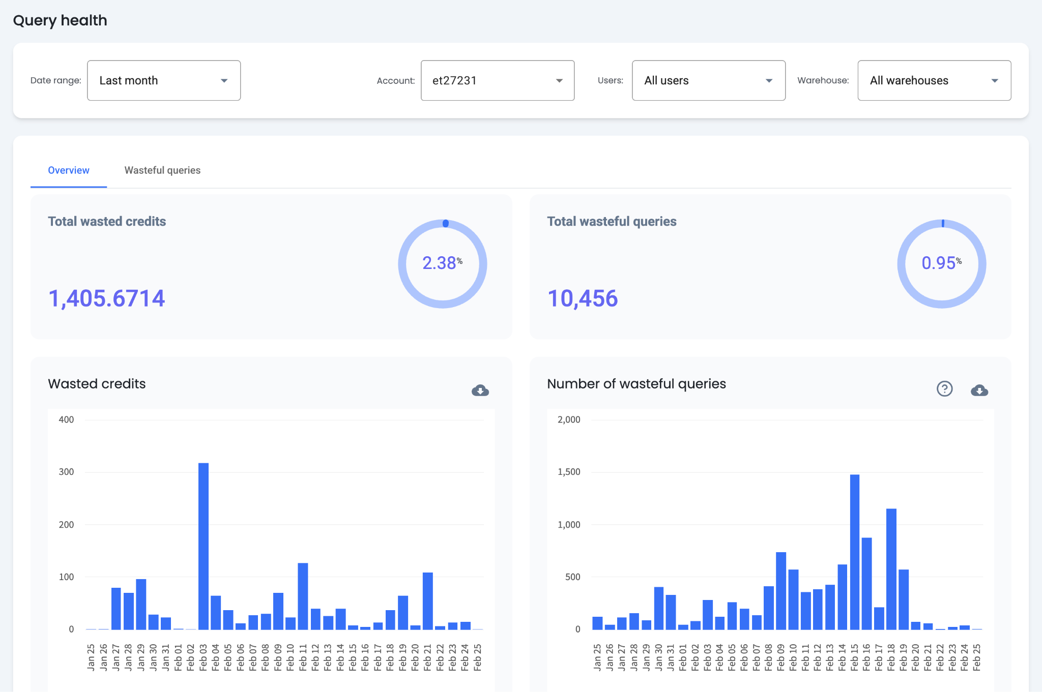 The Query Health overview charts provide insight into credits wasted by failed queries. Charts can be filtered by any combination of time range, warehouses, and users. Each chart displays data for a single account at a time.