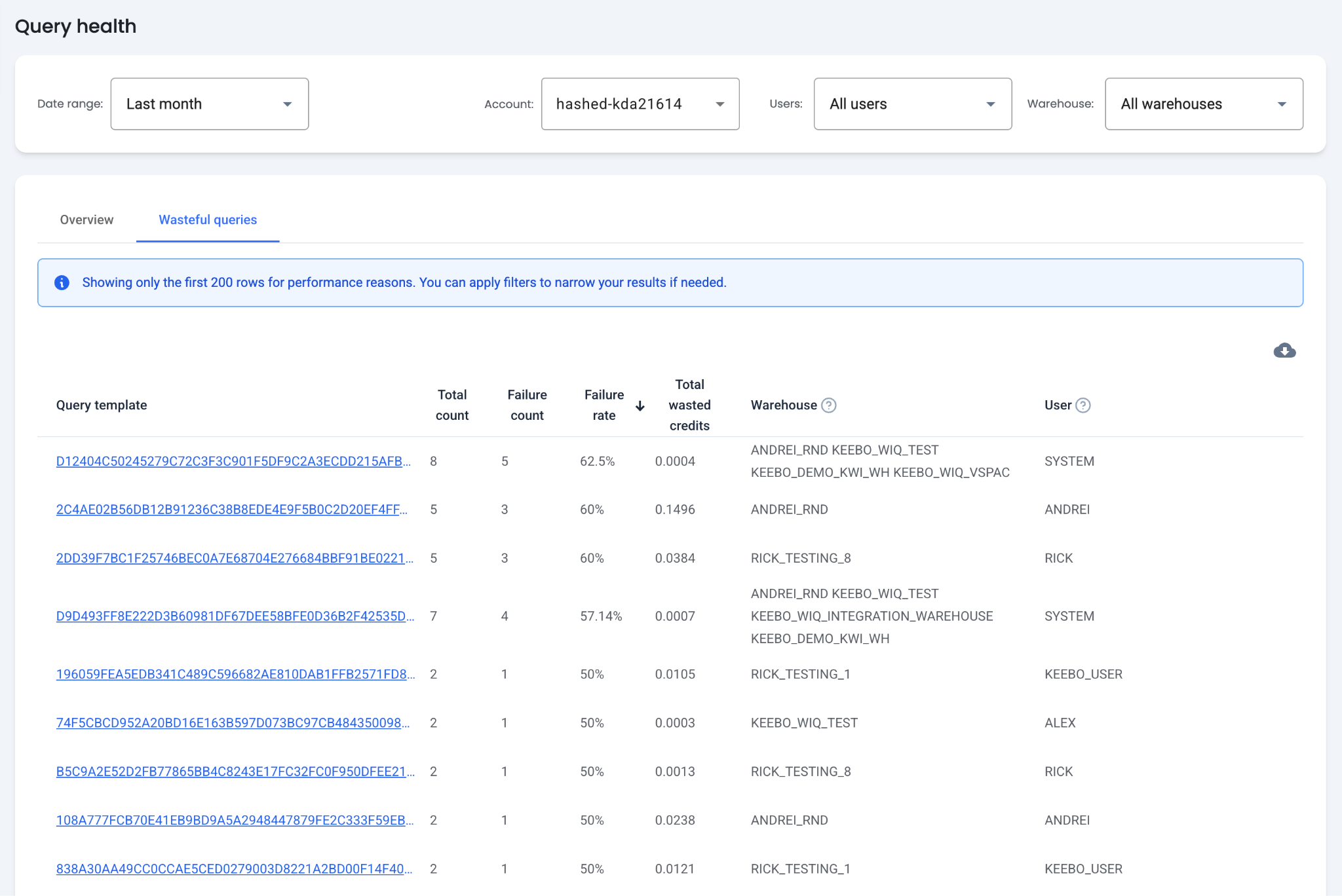 - Total Wasted Credits — The total credits wasted by failed queries for the selected period, along with the percentage of wasted credits relative to total spent credits.