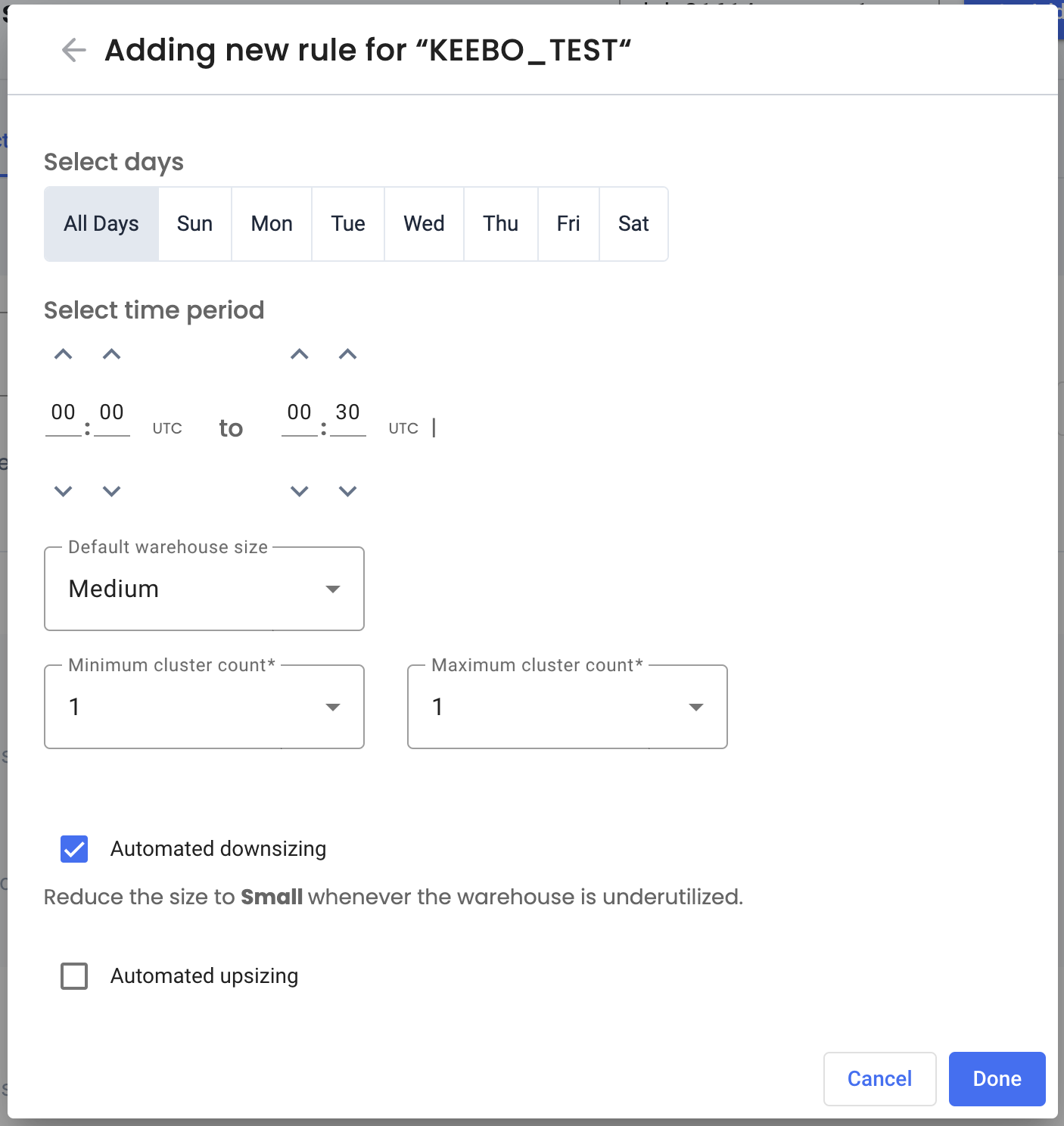 Custom rules define days and times where warehouse defaults change. For example, if query load on a warehouse is lower on weekends, a rule can downsize it to Small. Warehouse Optimization treats the new size as the default and continues to optimize.