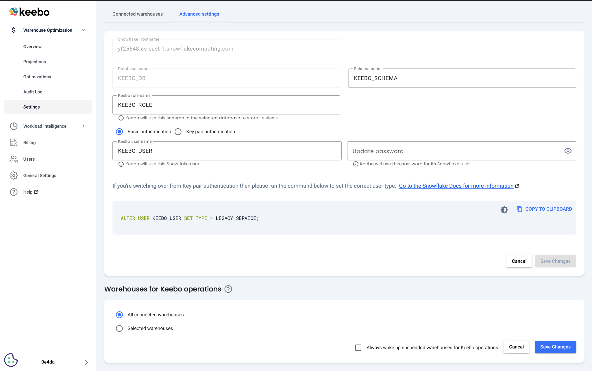 The Advanced Settings page supports updating the schema name, Keebo role name, Keebo user name, and password or private key for a selected account. Authentication methods can also be switched between basic and key pair from this page. Changing the authentication method requires running a command in the Snowflake console. Follow the instructions in the form to complete this step.