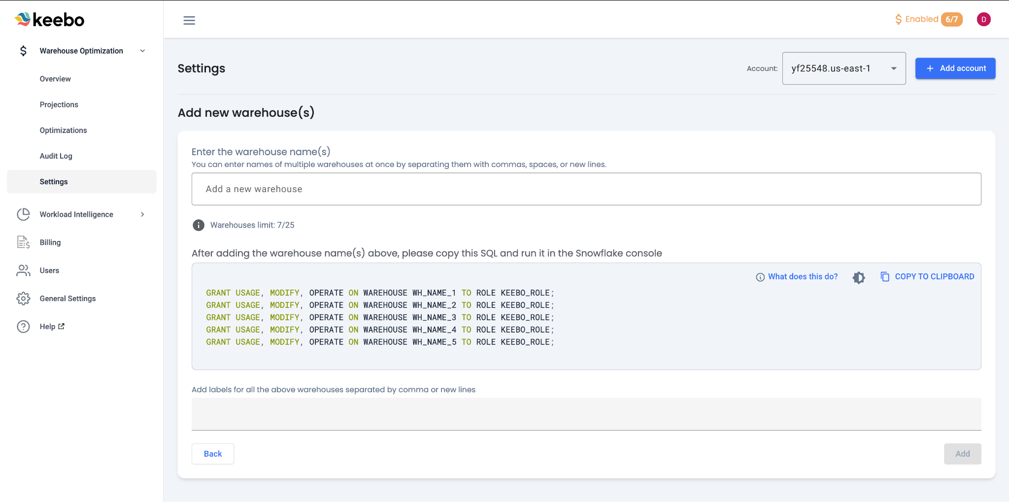 Warehouse Optimization supports optimizing warehouses across multiple Snowflake accounts. To add another account, navigate to Settings and click "Add Account."