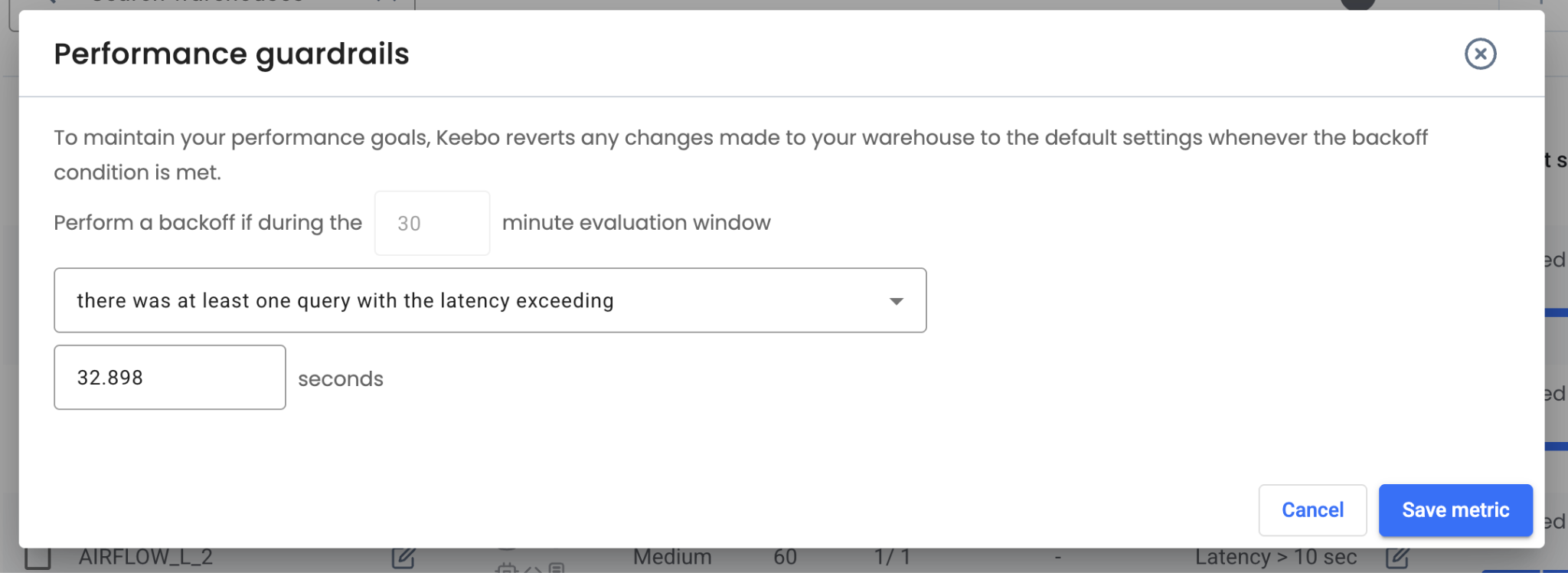 Conditional upsizing enables rules for a warehouse to upsize based on the same performance criteria available for backoffs. For example, a rule can upsize a warehouse if average query latency exceeds 100 seconds. This is a paid feature. Contact Keebo sales for more information.