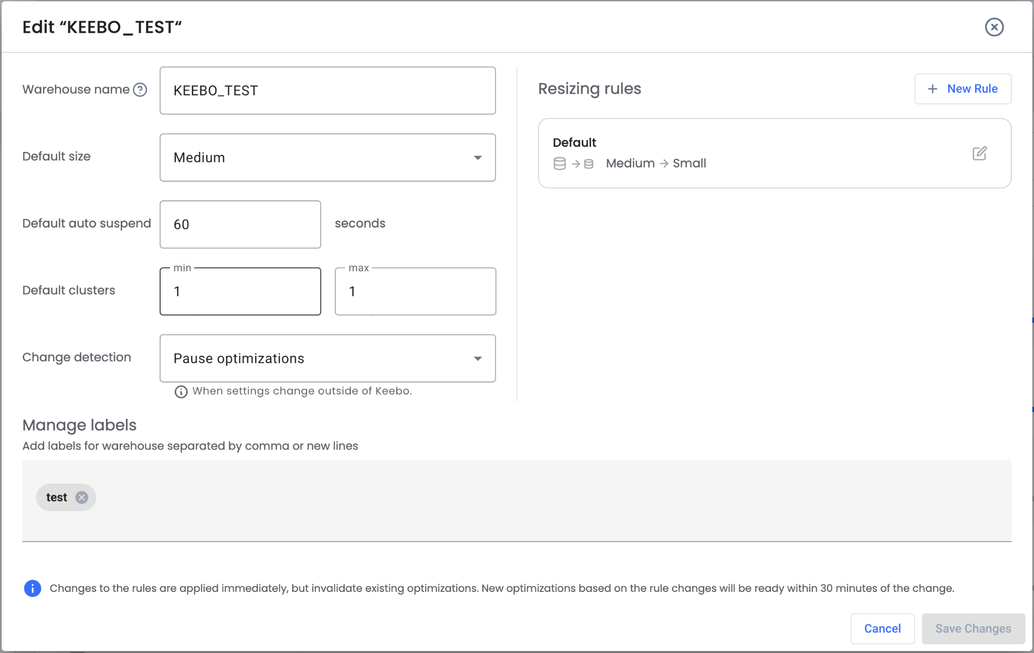 Warehouse Optimization automatically detects changes to onboarded warehouse size, auto-suspend, and min/max cluster values made outside of Warehouse Optimization. By default, optimization continues when a change is detected. Change detection can be set to pause optimizations instead.